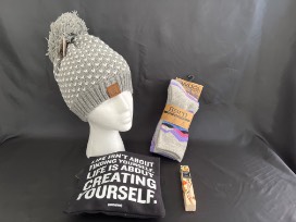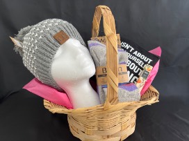 This basket contains a gray and white tasseled knit beanie hat to keep your head warm and a pack of three Born outdoor socks to warm your feet. Nest Seville orange perfume oil will fill your olfactory senses with pink grapefruit, orange zest and Neroli blossom and a small, zippered pouch can keep things handy for future use.