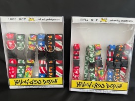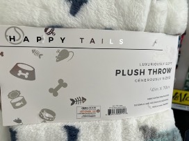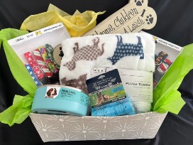 This package is full of items to care for the dog in your life! Included are two packages of adorable seasonable dog collars by Yellow Dog Design (six small 10-14" and six large 18-28"), a dinner bowl, a bag of biobased pet waste bags, a Happy Tails plush throw (50"x70"), and a cute welcome sign.