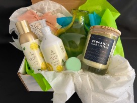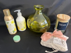 The basket contains a lovely green tinted vase, bergamot geranium candle, Thymes Lemon Leaf home fragrance, Thymes Lemon Leaf hand lotion, bar of Honeycomb handmade soap, and Bert's Bees Sweet Mint lip treatment.