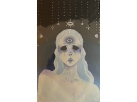 "Oracle" - A young girl traded her two eyes for a promise of "all-sight". Upon receiving her "gift", instead of keeping her two eyes they combined them into one. Leaving her with emptiness inside. She is still able to see, just not like she thought it would be. She is able to help people with this new "gift" but for herself, she is still longing for her own help and never feels fulfilled.