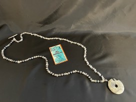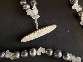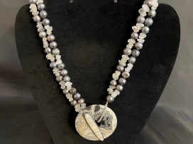 Beautiful handmade Ocean Jasper necklace with sterling mother of pearl inlay, quartz, and gray fresh water pearls. NHandmade by Michelle Jarrett of Funky by Nature.