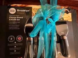 This package includes wood serving cutting board with handles, slate cheese board, and knife set and a $25 Fresh Market gift card.