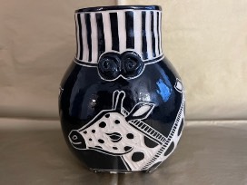 Additionally, Leanne leaves no surface unadorned. The back side of her work is usually as intricately detailed as the front! Designs on her pottery include dreamy Alice-in-Wonderland like characters, rabbits, crows, owls. Currently, she is smitten with her 100 tall, "wonky" bottle project, two of which are in the upper right hand corner.
