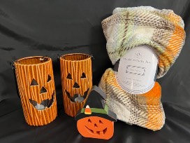 This basket contains two ceramic jack o'lantern candle holders with votives, wooden pumpkin decor, fall throw, and a $20 Starbucks gift card.