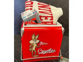- Red mini cooler for tailgating + picnicing with vintage coyote graphics