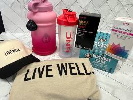 • Large Live Well T-Shirt, Live Well Hat, Hydrojug, Blender Bottle, Bday Cake Protein Bars, MegaMen Supplement, Multivitamin