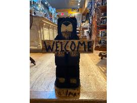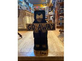 Adorable hand carved wood bear statue with sign that can be flipped from "Welcome" to "Go Away" from the Adirondack Store, New Canaan