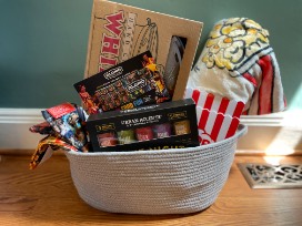 (1st - Hoisl) Treat yourself, your family, or your favorite movie lover(s) to a movie night-out on the town or at home-with this fabulous movie-themed basket! Basket includes 4 passes to Alamo drafthouse ($25 each, redeemable at any location), along with everything you need for a deluxe movie night on the couch at home-gourmet popcorn set, retro crank popcorn machine (that the kiddos can crank-makes a family's worth amount of popcorn, with individual fixins!), cozy jumbo movie-watching blanket, movie-themed socks, and classic style popcorn buckets. Plan a date night for you, your S.O., AND a family night at home (or many!). You won't want to miss out on this deal that keeps giving!