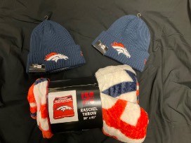 Cheer on the Denver Broncos with two tickets for one game during the 2023 season in Section 233 Row 16 seats 26-27 (aisle seats). Also included are two stocking caps and a cozy Broncos blanket.