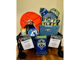 Check out this amazing "basket" - it's actually an outdoor utility wagon filled with everything you need to train like a Seattle Sounder! Complete with Sounder merchandise, including a hat, jersey, and scarf, as well as a yeti cooler, soccer ball, pop-up soccer goal, a hands-free soccer trainer, and backpack, this bundle has it all. The package also includes two full-day camp registrations at Lil' Sparks 2023 Crossfire Summer Day Camp, a $500 value!