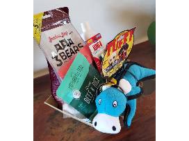 From our friends at Earthwise Pet Lake Tahoe! Here's a fun basket for your furbaby. It includes: Tuffy cow dog toy, Earthbath (coat brightening) shampoo, No-hide venison recipe dog chew, 2 Portland pet food pouches, Grandma Lucy 3 Bears Beef, Kong teething stick, Wondercide flea and tick spray, and misc. treats