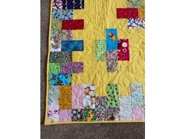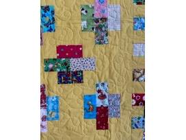 "A Child's World" was designed, pieced and bound by Juliet Lund of South Lake Tahoe. Juliet meticulously placed each unique piece of fabric so the animals are all facing the same direction. The cute animals and other designs make this quilt a delight! The longarm quilting was done by Karen Miner. This quilt measures 53" x 65" and the back of the quilt is just as darling as the front.
