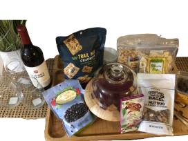 Custom made charcuterie board and custom made cheese dish,Wine, decanter,wine glasses and snacks