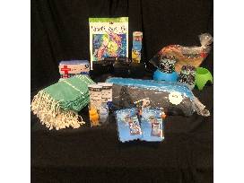 Bag includes 2 cup holders, 2 thermal mugs, 2 waterproof phone holders, 1 first aid kit, 2 bottles of sunscreen, 1 beach tent, 2 beach blankets, 2 pairs of sunglasses, 2 lip balm , sea coloring book and red pencils!