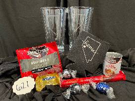 Two Nevada beer glasses paired with beef jerky, cocktail nuts, and chocolate to make a great game day!