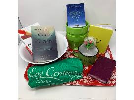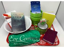 This basket is full of Christian books and items for entertaining. The set inlcudes a small plum colored Bible, Eve Center Journal, "Boundaries" paperback book, "When I Don't Desire God" paperback book, large Eve Center t-shirt, Eve Center Coffee mug, "A Shepherd Looks at Psalm 23" paperbackk book, 2 green flower pots, 2 red paisley serving trays, blue paisley serving bowl, and red paisley plate.
