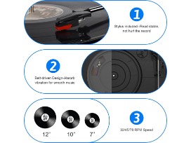 - Easy to use, simple setup and operation. Great ideal for vinyl lovers. Three-speed Turntable (33, 45, 78 RPM) plays all of your 7" 10" 12" vinyl records.