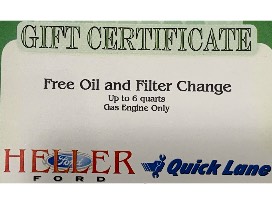 2 Free Oil and Filter Changes from Heller Ford, up to 6 Quarts, Gas Engine Only