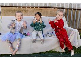 Title: Splash Dance! - Inspired by the children's love of running, jumping, and performing BIG body movements, ....is a creation based on a technique called "action painting", made popular by the artist Jackson Pollock. The children loved dripping, splashing, and throwing paint as they danced and moved around the canvas.