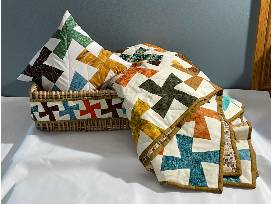 Your are just going to love the vibrant colors and quality hand-crafting of this quilt throw sewn by one of our own Rotarians. Measures approximately 40x60. Includes pillow and matching basket. Throw on some fuzzy, sockets, pop some corn, pour a glass a wine, and snuggle up to read or book or watch your favorite flick.
