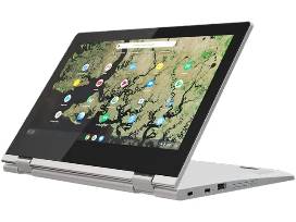 Lenovo C340 11 Convertible 2 in 1 Chromebook: Handle everyday work tasks with this compact Lenovo Chromebook. The 11.6 inch IPS HD display offers accurate color reproduction, and the built in microphone and 720p webcam enable clear video conferencing. Preloaded with Chrome OS, this platinum gray Lenovo Chromebook has 4GB of RAM for smooth multitasking, and the 32GB of eMMC memory loads and saves data quickly.