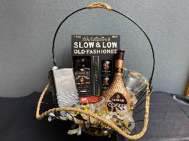 Do you like your coffee with a little kick? Or maybe, you like your whiskey with a little coffee. Either way, this basket has you covered. It starts with Hochstadter's Slow & Low 84 Proof Rye that includes rock candy, raw honey, aromatic bitters & navel orange. Packaged with that are 2 100 ml cans of Slow & Low Coffee Old Fashioned. If you want something with a bit more of a kick, try the Stillhouse Black Bourbon, which is a blend of whiskeys that has been mellowed in small batch coffee beans. Rounding out the basket is a bottle of Somrus Coffee Cream Liqueur, which is a silky, creamy medley of rich roasted coffee notes & chicory, enhanced by real dairy cream, handcrafted rum and complemented by the perfect touch of sweetness. The basket also includes 2 glass mugs you can use to enjoy your coffee drinks.