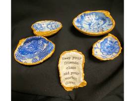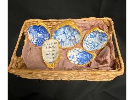 Perfect for that beachy feel. This basket of handcrafted shells is beautiful in shades of blue. Add humor with the other shell in this collection by MMelinda Hakeman. Add to your decor with a $30.00 gift card from Betty Kelly's in Fayetteville, NC.