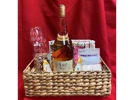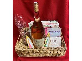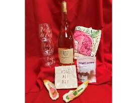 Rose All Day!!! Enjoy this themed basket using the Bergstrom Pinot Noir Rose 1.5L bottle 2021. Basket includes handcrafted shells, napkins, wine gummies, acrylic glasses and a rose themed beach towel!