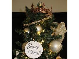 6 Foot Light Tree. Names of Jesus Ornament. Crown of Thorns and Bronze Crown Topper. Woven Basket Tree Base
