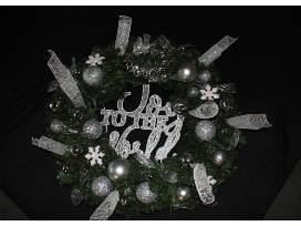 Green wreath accented with silver ornaments, A "Joy to the World" sign, and silver bells
