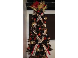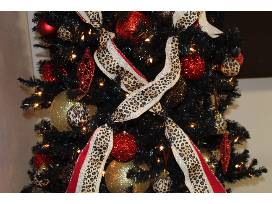 7ft. black prelit tree decorated with red, gold, black and leopard print ornaments. It has a beautiful red and gold topper with a leopard and red tree skirt.