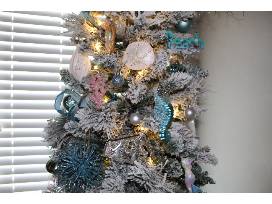 6' tree, snowf flocked, featuring aqua blue and white balls, seahorses, white sand dollars, oysters, and starfish.