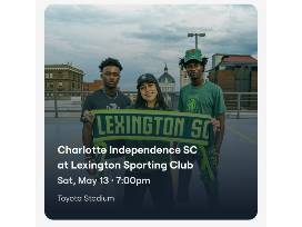 Great seats for Charlotte Independence SC at Lexington SC on May 13, Section 103, Row M, Seats 6-10.
