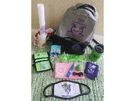 Phins to the West Memorabilia- Backpack, 10oz ultimate cooper drinkware., Tiki Mug, pink cooling towel, my life trop rocks koozie, lime green ptyw pouch, mask, shotglass necklace, green slotted glasses, bubbles, Kazoo, duck, pin