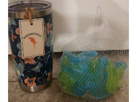 #209- Margaritaville lg 15 btl_24 can cooler. Keeps ice 12 hours, easy access top, leak free, removable hard liner. MARGARITAVILLE Easy Rider pool float with grab roap, 3way value for quick inflation, drink holder, mesh bottom. 20 Oz Margaritaville stainless tumbler stays hot for 12 hrs, cold for 24 hours. Bag of Parrot ice cubes.