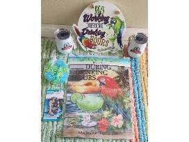 #211- Margaritaville No working during drinking hours sign. Two Margaritaville wine tumblers. Shark ice cubes, small themothator and flag no working during drinking hours.