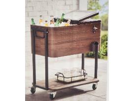 Stylewell 80qt Brown patio Cooler. 15.5in W x 33in L x 31.75 H. Resign insulated. steel body. Powered coated black frame with attractive wood grain finished body. Bottle opener with cap cup. Lower tray for storage. Ball bearing casters (locking). No beverages or glass tray included.