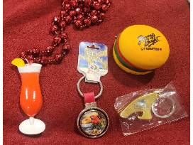 $25 gift certificate to World Famous. $50 gift certificate to Dirty Birds. $50 gift certificate to Bare Back Grill. Cocktail beaded necklace. No passport required key chain. Landshark bottle opener jeuchain. Jimmy's Buffet squeeze.