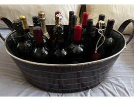 Tommy Bahama leather and metal beverage tub filled with 16 bottles of various vintages, varietals and locations. Something for everyone's enjoyment!