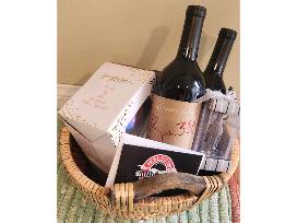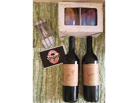 two bottles of Miramonte Wine Bin 380 2021 and Grenache 2018. $75 Bully's gift certificate. Sugar studio set of two stemless wine glasses. Wine bottle key chain with cork screw.