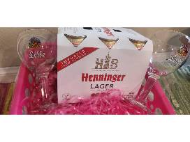 Three Gary Seiler Cds 6 pack of Henninger Lauger. Two Jeffe beer glasses.