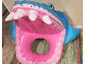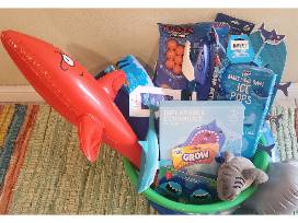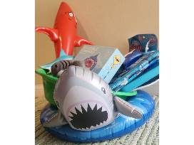 Large pink and blue shark float. Large blue shark float. Shark Beach towel. Inflatable cornhole. Shark popper game. Novelty shark glasses. Make your own shark ice pops. Grow creature shark. Shark headband. Plastic shark. Stuffed shark w/surfboard. Blow up shark ring. Shatk mask.