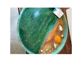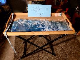 Made with resin art. Good for cold or room temperature dishes. Removable art. Foldable legs. Also serving tray.