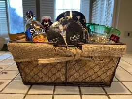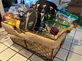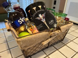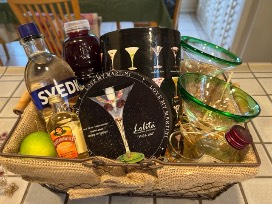 Gift basket with hand painted hula-tina martini glass, 2 green martini glasses, shot glass, Svedka vodka, cranberry juice, cherry cordial, mini Margaritaville tequila, and mini Starbucks coffee liqueur.