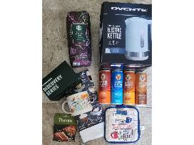 #113- $15 Panera Bread gift card, ovente pronto fill Electric Kettle. Starbucks Itialian Roast 1lb. Starbucks Discovery Series San Diego Coffee mug. Kitchen towel and pot holder. 4 cans of Victor Allen's Iced Coffee Latte, Mocha, vanilla, caramel, and pumpkin spice.