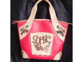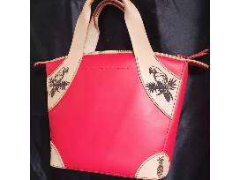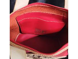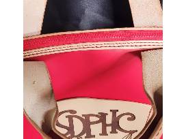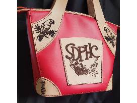 Fully handmade & handsewn. Real Leather (Red). Designer chrome tan leather, full grain tan leather from Tandy Leather. SDPHC logolasered onto the outside pocket along with parrots and pineapples around the body. Very roomy, has inside pockets to hold plenty of items for the next Parrot Head Party! 12x12x5.