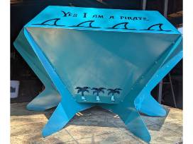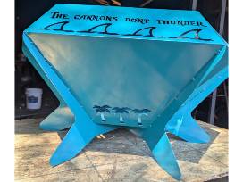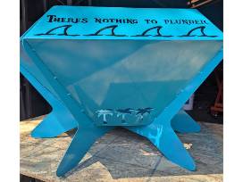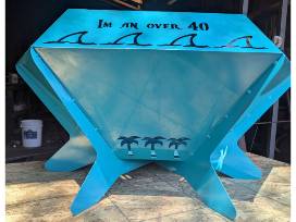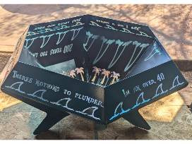 #513- Handcrafted by Joe McKinney metal fire pit. A Pirate looks at 40, song lyrics on each side.