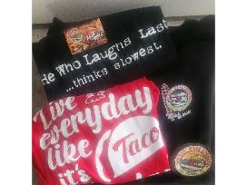 #149- $50 gift card to Rockin Baja Lobster. Black sweatshirt 2xl. Red xl tshirt. Black xl tshirt. Stickers from Rockin Baja Lobster.