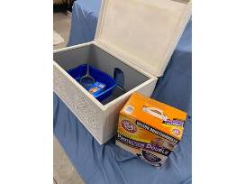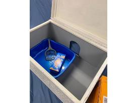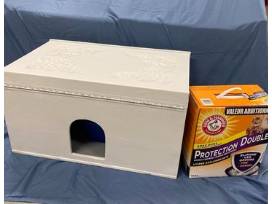 Comes with a new litter pan, new litter scoop and a box of clumping litter.
