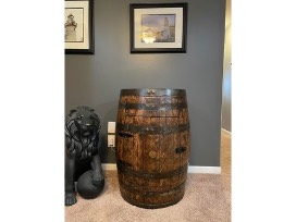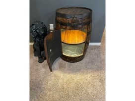Full sized refurbished whiskey barrel cabinet. Sanded, stained and sealed with polyurethane to perfection. Complete with shelves, door and interior LED lighting. This statement piece will quickly become your favorite piece of furniture!